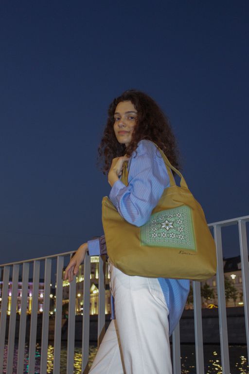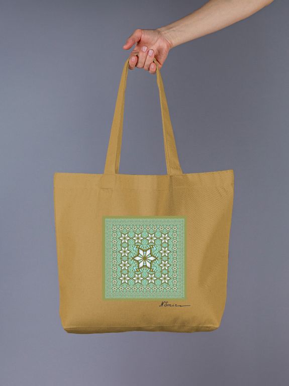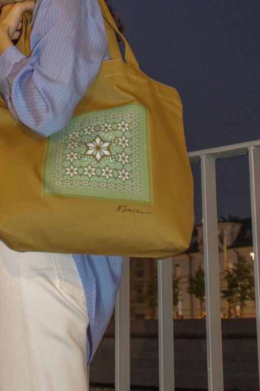 ❖ Сумка-шоппер из плотной саржи цвета горчицы. Принт выполнен по мотивам авторского цифрового коллажа дизайнера Наталии Смирновой "Снегопад". Сумка с подписью автора - лимитированная коллекция!.