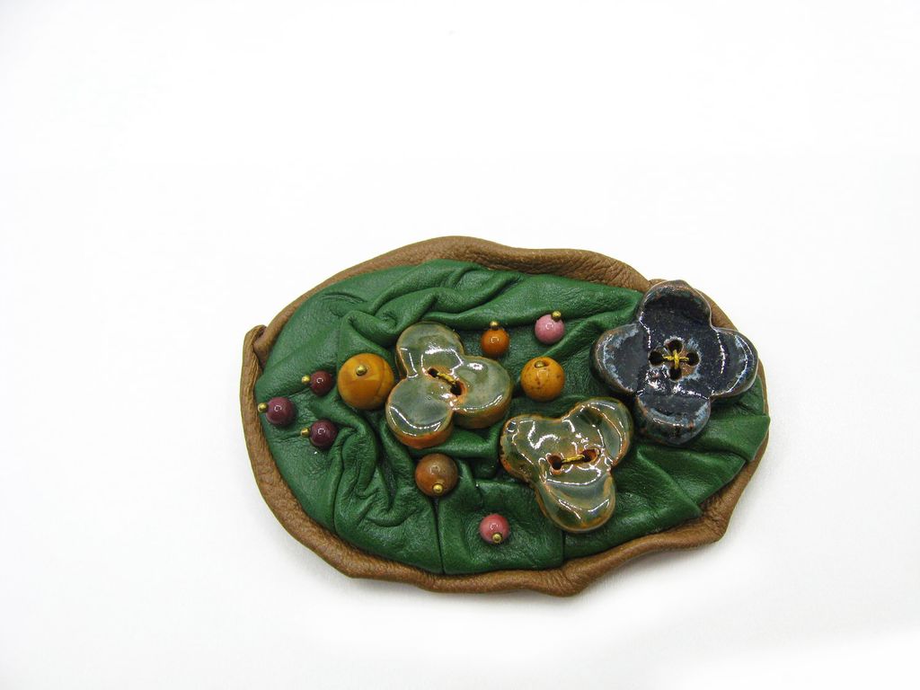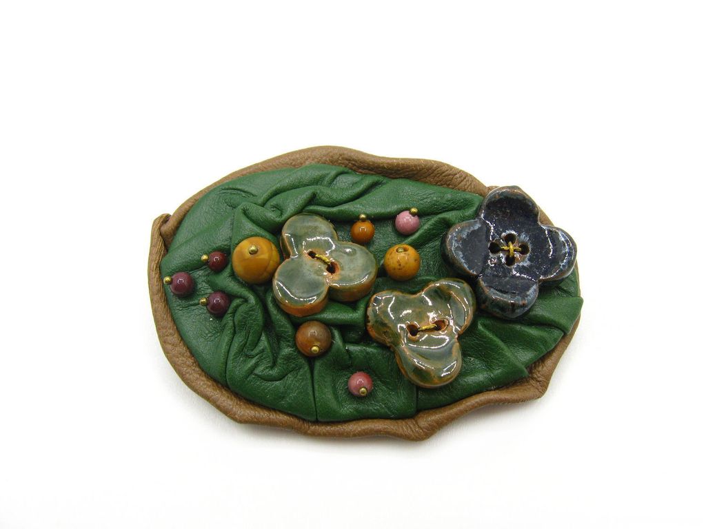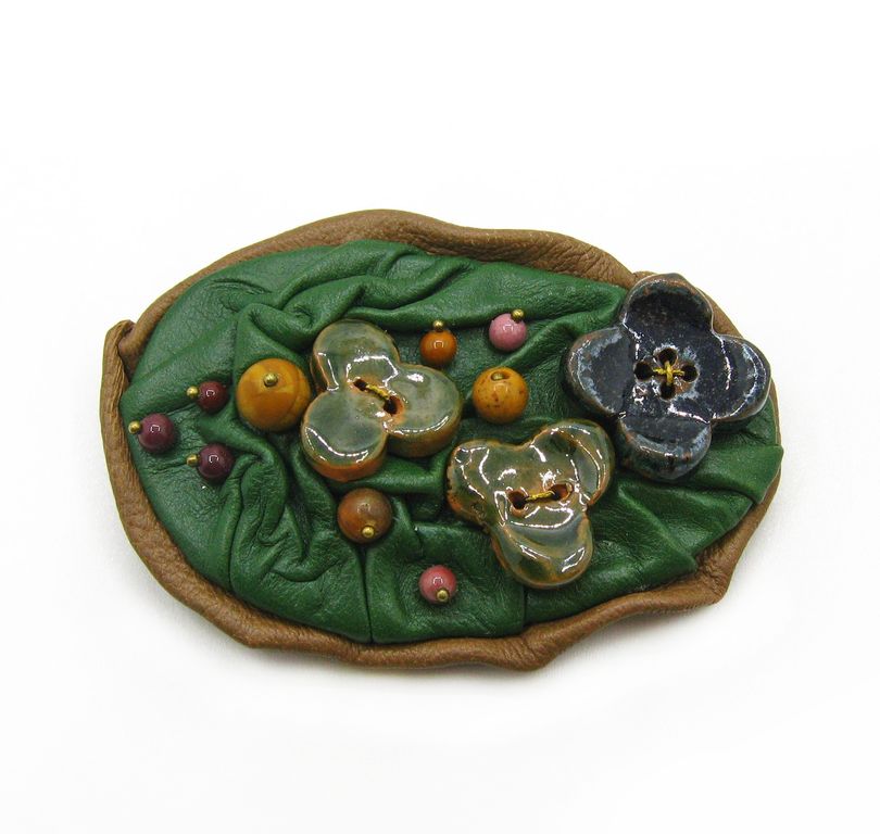 "Лесная поляна". Брошь из кожи с яшмой и керамикой, украшение ручной работы