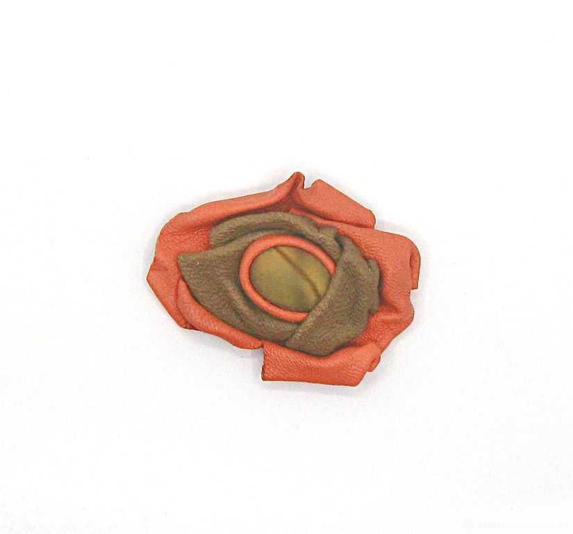 ❖ Сердце композиции — натуральная яшма — древесно-коричневый кабошон с тёплым подтоном, напоминает о спокойствии и гармонии, а рыжие "лепестки" кожи, напротив, вдыхают в образ энергию жизни.