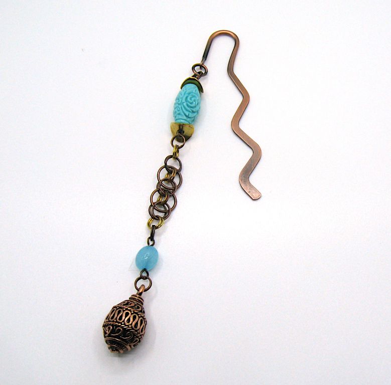 Все это я попыталась отразить в своей работе: переплетения колечек, узоры на бусине (искусственная резная бирюза) и на медной красивой подвеске. Также закладку украшает бусина голубого кварца.