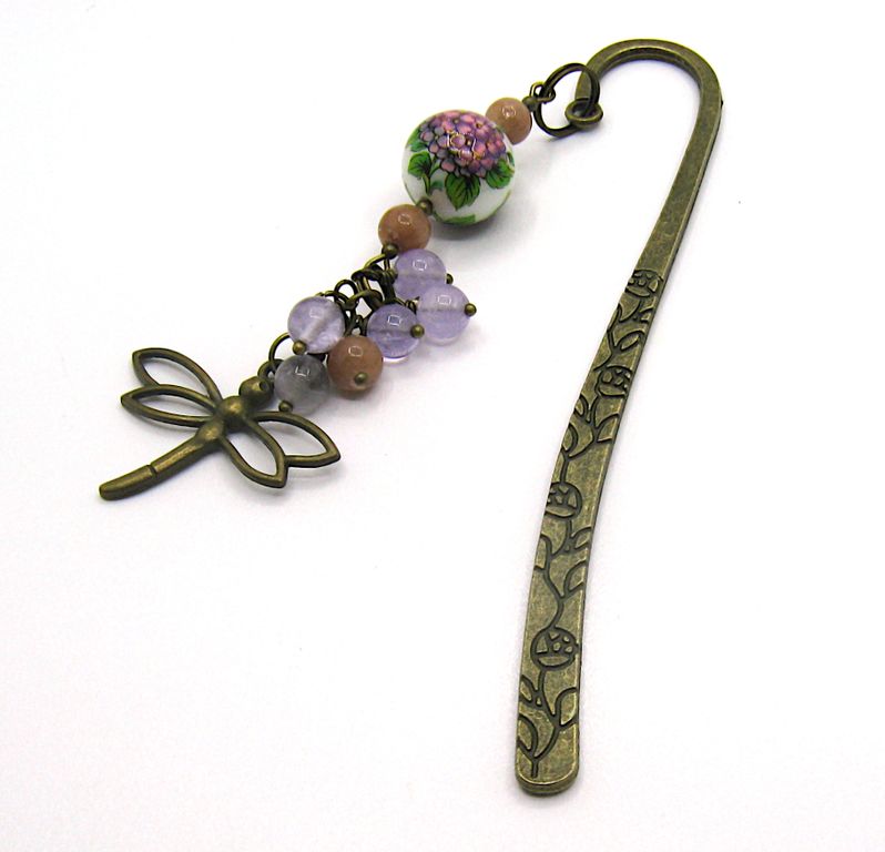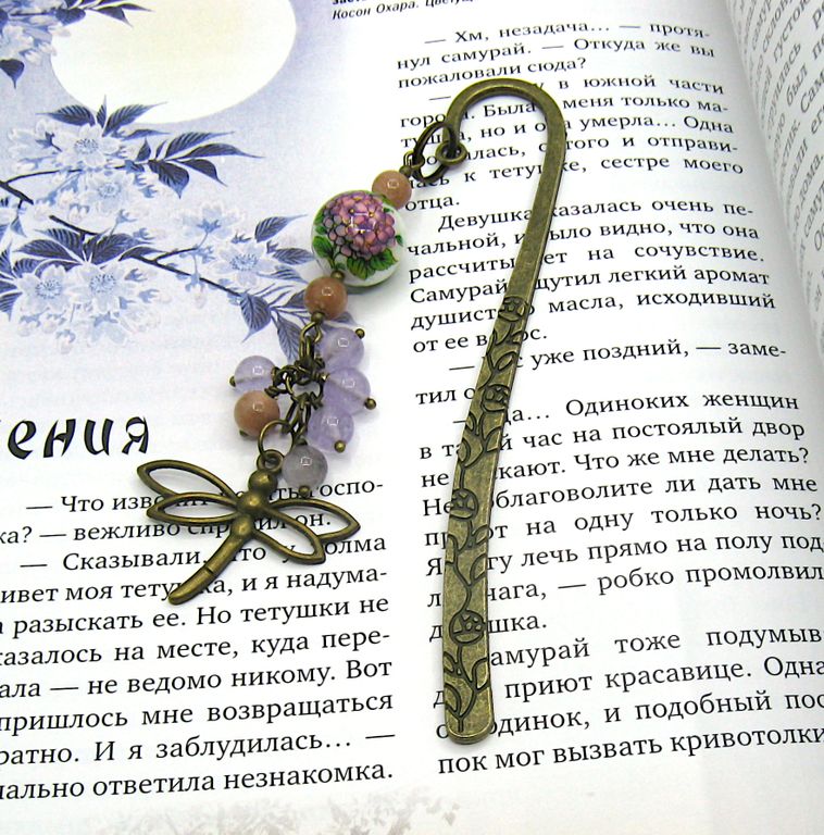 ❖ Красивый цвет бронзы и уникальный набор бусин отличают эту закладку! Посмотрите, как чудесно оттеняют друг друга ореховый нефрит и нежные аметрины. А как хороша бусина Тенша с цветами гортензии!